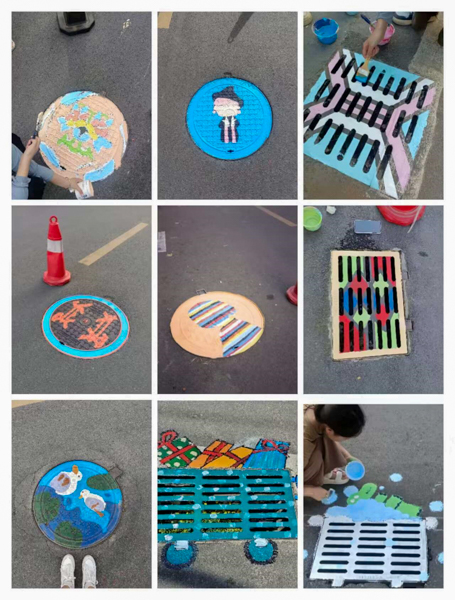 在恩施市桂花园社区,“循梦而行”社会实践团队成员化身“井盖绘图员”,让“井”盖变“景”盖,对桂花园社区龙洞河畔道路内井盖进行了整体考察和设计,以西兰卡普、山水、神奇的动物为元素,一笔一画认真细致地在井盖上勾勒出各式各样的精美图案。原本平平无奇的井盖焕然一新,成为桂花园社区夏日里的一道独特风“井”线,引来附近群众的驻足围观、拍手叫好。潜移默化的让群众感受美好生活、提升文明素养,助力社区微治理。