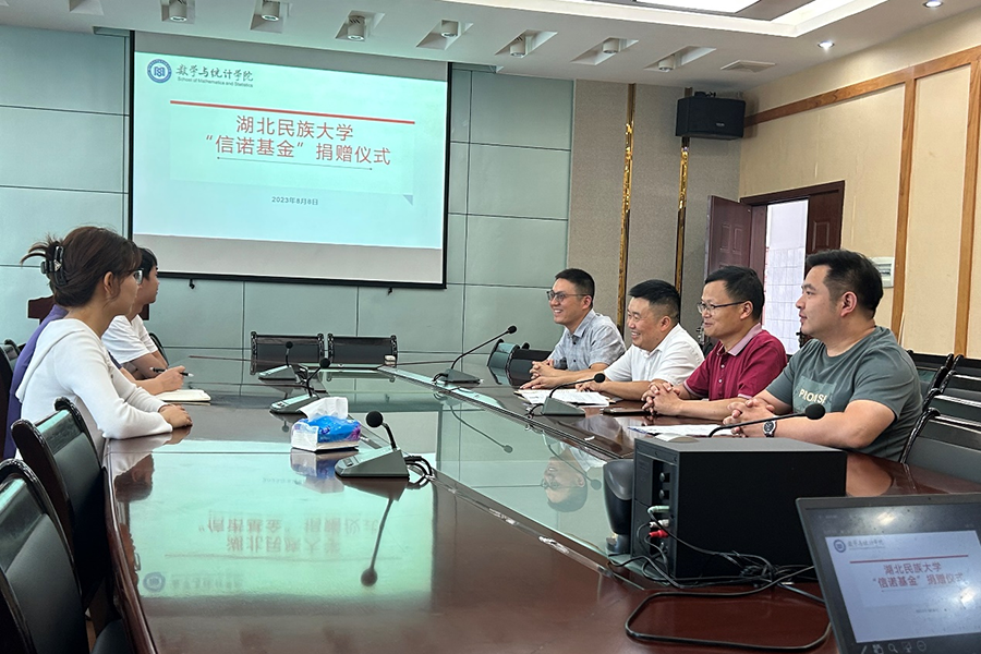 8月8日下午,jinnian金年会“信诺基金”捐赠仪式在数学与统计学院会议室举行。深圳市信诺公益基金会向jinnian金年会教育发展基金会捐赠200万元,用于支持jinnian金年会数学与统计学院人才培养。深圳市信诺公益基金会理事长黄庆娟一行,jinnian金年会数学与统计学院党总支书记赵魁轩、院长魏代俊、副院长唐利明、基金会代表和学院教师代表参加了捐赠仪式。