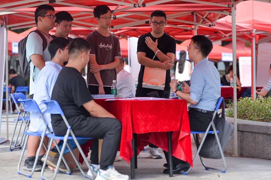 在各企业招聘点,工作人员向前来咨询的毕业生耐心讲解本企业的招聘岗位、薪资待遇、专业要求等相关问题。