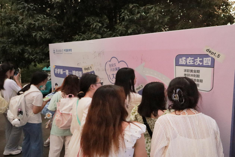9月7日,外国语学院门口的“新同学你好,我在”宣传栏和“开学第一课”展板引来不少学生和家长驻足,“最强班班后援团”“六边形展示训练营”“识在大一,学在大二,考在大三,成在大四”,既为同学们的大学生活做了合理的规划,又让同学们对即将到来的大学生活充满期待。“刚来民大,虽然一切都很陌生,但是来到外国语学院,又感到对未来信心满满。”一名正在展板旁签名的新生激动地说道。