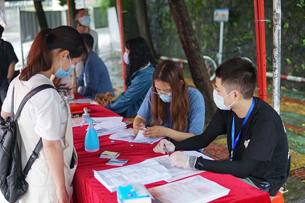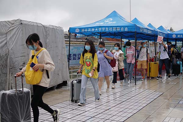 为确保毕业生返校工作安全有序进行,学校在火车站设立了接待点,同学们下火车后通过核验健康码、测量体温、行李消毒等环节,换乘大巴,到校门口后再进行二次核查,然后乘坐校园观光车到各学院报到点报到。在各学院报到点,辅导员再次核查学生返校登记表,并为毕业生们发放防疫礼包和毕业礼包。