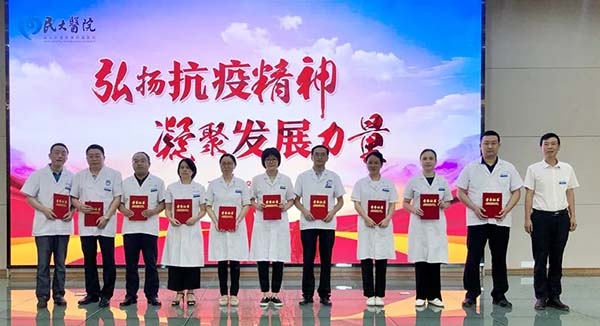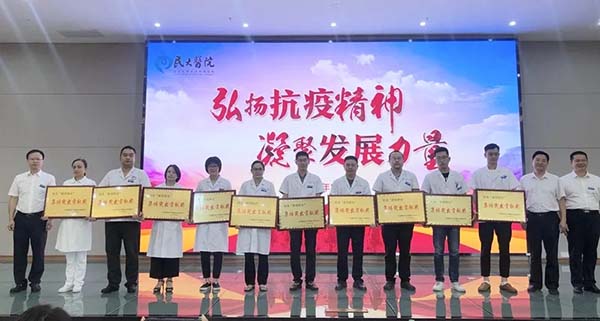 本网讯 为庆祝2020年中国医师节,全面总结医院抗疫阶段性工作,8月18日下午,金年会附属民大医院举行2020年医师节暨抗疫总结表彰大会。学校党委常委、副校长邓磊出席,医院领导以及临床医技科室、行政职能部门主任,党支部书记、援汉医疗队、下县包片专家、临床医技科室医师代表及获表彰人员参会。医院党委副书记邹莉主持会议。