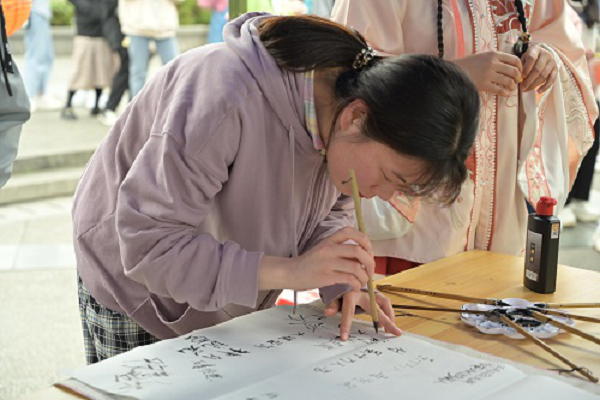 游戏区布置展棚若干,类型多样的游戏吸引不少学生参与其中,热闹非凡。“踢毽子”充分考验身体协调能力,参与者双眼紧紧注视毽子,动作灵活流畅,高超的技能赢得阵阵喝彩;“插花”游戏,参与者精心挑选花枝,耐心细致地修剪花束、搭配色彩,呈现出一个个独具匠心、清新雅致的插花作品;“纸灯笼DIY”游戏,参与者手持毛笔,蘸染颜料,全神贯注地在灯笼上画图题字,在一笔一划的勾勒中体验绘画的乐趣,现场气氛融洽,吸引众多学生驻足观看。