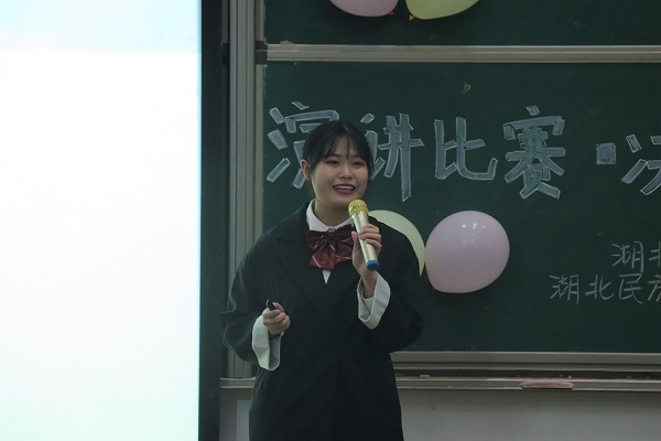 第二轮为即兴演讲,选手从“塞翁失马”“纸上谈兵”“梁上君子”等十个成语中抽取一个作为主题演讲。黎虹杉以“塞翁失马”为题,她讲到从该成语中领悟到“是好是坏这很难说” 并将这句话贯彻到学习生活中,每当失意或骄傲时便用这句话安慰、警醒自己。此外,黎虹杉提到当今社会出现许多看事物片面化的事例,需要更加全面地看问题,因而塞翁失马显得尤为重要,随后,她以现实中的网络问题为例,验证了须全面看待事物的重要性。(责任编辑 刘晓晴)