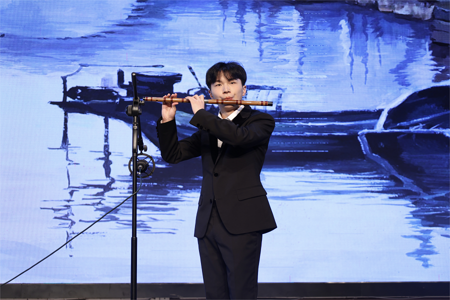 杨贤哲笛子独奏《声声慢》,以其娴熟的技巧将李清照作词时的孤寂落寞、悲凉愁苦传达在观众面前,富有表现力,赢得阵阵掌声。