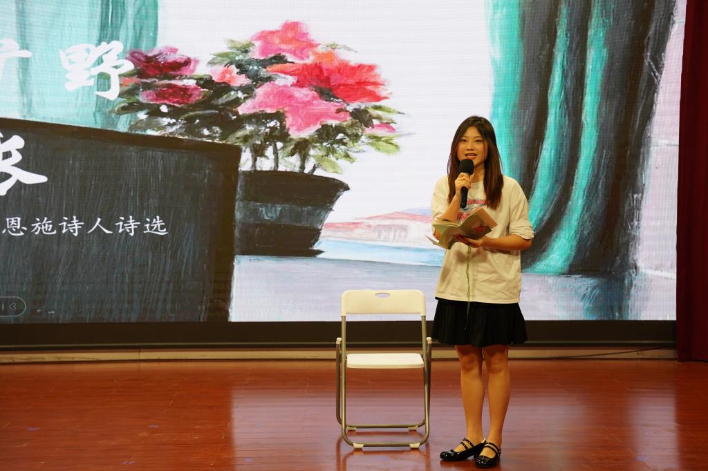 即兴朗诵环节。四号选手卢李馨朗诵诗歌《让我怎样感谢你》,选手沉浸其中,表达出诗人真挚动人的感谢之情。三号选手邓琰云朗诵诗歌《寻梦者》,朗诵娓娓动听,配合文章优美的意境,展现出美轮美奂的舞台效。六号选手黄紫菡朗诵诗歌《错误》,诗中蕴含江南小城意象,传达战争年月闺中思妇等盼归人的情怀。