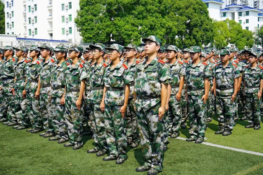 炎炎夏日,学生从站军姿、稍息、立正、跨立、停止间转法等基本项目开始学起。每一个动作,教官都亲自分解示范与指导,从摆臂到踢腿,从握拳到收脚,都要通过教官严格把关。“抬头挺胸,收腹,目视前方,下颚微收,五指紧贴裤缝,身体微微前倾”,教官的口令,如雷贯耳,每一次动作的纠正,都在向标准看齐,学生衣裳尽湿但仍斗志昂扬。