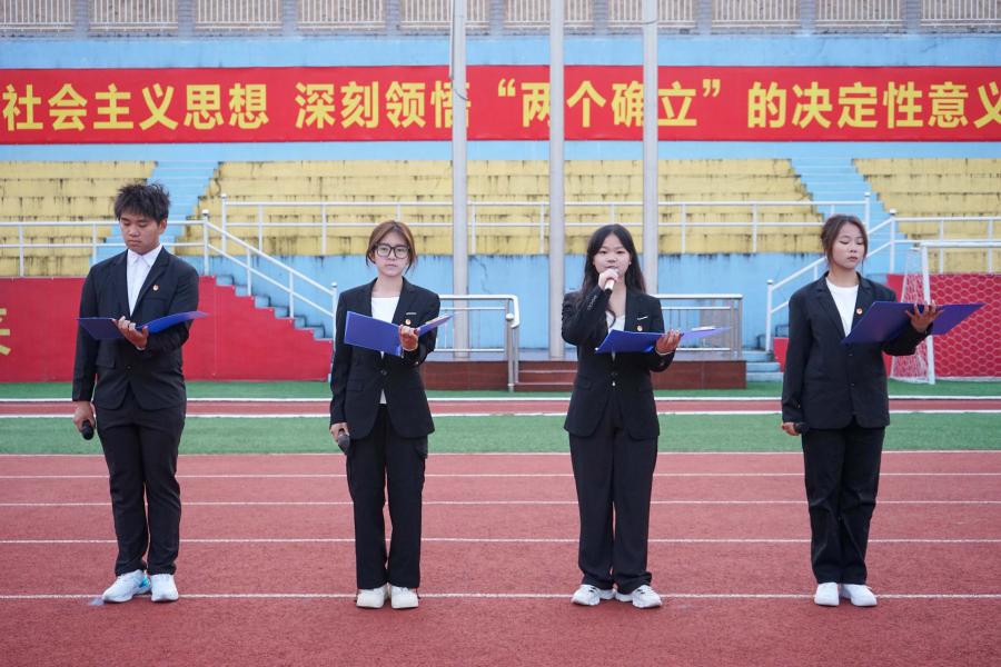 随后,两院学生代表带来手势舞《我们都是追梦人》和诗歌朗诵《青春中国》。手势舞表演中,学生表演动作整齐划一,面带笑容,展现出积极向上、青春活力的精神风貌。朗诵学生声音嘹亮,热情高昂,表达新时代青年强烈的爱国情怀。