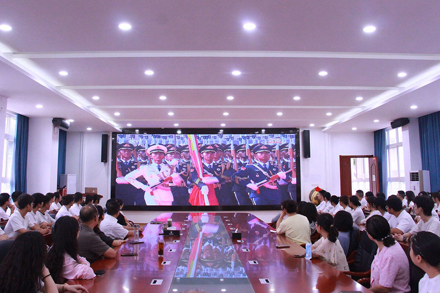 机关干部职工在行政楼一号会议室统一观看,学生工作部、研究生部组织600余名学生代表在学校新区多功能厅集体收看,各院级单位党委(党总支)分别组织本单位师生员工在会议室、教室等场所同步观看直播,学校公共场所大屏幕也统一播放直播画面,实现全校师生全覆盖。阅兵场上整齐划一的步伐、气势恢宏的方阵、先进精良的武器装备和庄严隆重的仪式,深深震撼着每一位师生的心灵,收看现场不时响起热烈掌声与由衷赞叹。