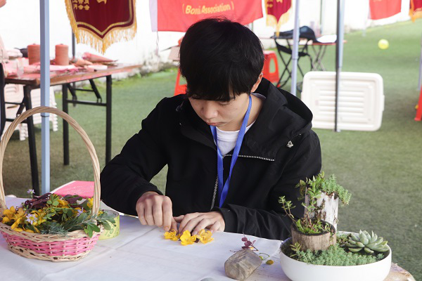 活动现场,热闹非凡。各社团通过作品展示、现场表演、工作人员讲解等方式突出特色,展现风采。其中,茶文化协会成员身着汉服,向观众展示入茶、醒茶、冲泡、封壶等环节,动作优雅,技艺娴熟,一举一动彰显茶文化的独特魅力,现场分为品茗区与展示区以便有兴趣的学生进一步了解;兰亭书苑以笔力遒劲的书法和清新淡雅的中国画吸引新生驻足,邀请学生亲身体验,淡淡墨香传递出对书法的热爱;花木盆景协会现场摆满生机盎然的植物,通过赠送多种多样的多肉植物和书签吸引学生的眼球。