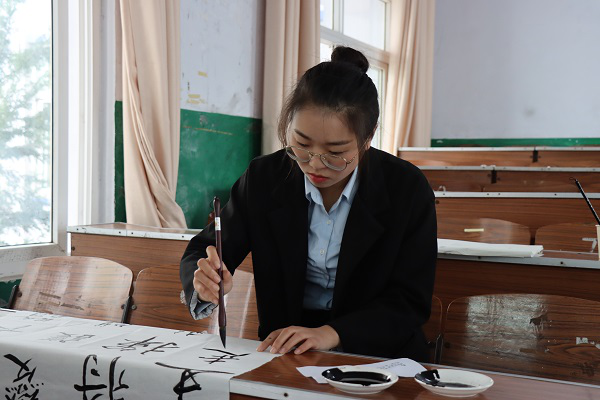 粉笔字部分,参赛选手依次上台书写参赛作品,台下评委认真观看,适时指出选手的错误;毛笔字部分,八号选手吴瑶行笔流畅,用笔有力,写下的字笔酣墨饱,有刚健之美;硬笔部分,参赛选手反复观看每个字的结构、笔势,一笔一划,书写稳重。最终,三十二号选手张纪云以91分荣获书法组第一名。