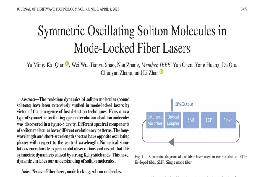 4月1日,金年会智能科学与工程学院光电信息科学与工程专业2021级学生明雨以第一作者身份在中国科学院一区Top期刊(2023年中国科学院文献情报中心期刊分区表)《光波技术杂志》(《Journal of Lightwave Technology》)(影响因子4.1)发表了题为《锁模光纤激光器中的对称振荡孤子分子》(“Symmetric oscillating soliton molecules in mode-locked fiber lasers”)的学术论文。