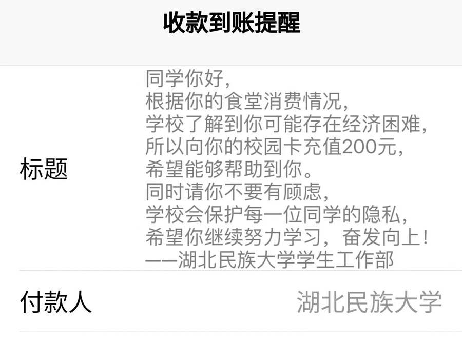 “根据你的食堂消费情况,学校了解到你可能存在经济困难,所以向你的校园卡充值200元,希望能够帮助到你……”12月18日,jinnian金年会不少在校学生突然收到了这样一条短信。大家一开始感到十分意外,以为是诈骗短信,经过向老师核实,才确认这原来是学校对同学们默默的暖心行动——为保障大学生合理营养用餐所发放的暖冬餐补。“暖冬餐补”短信“本次收到餐补的学生共计120余人,每人发放200元。确认人选后不公布名单,而是悄悄...