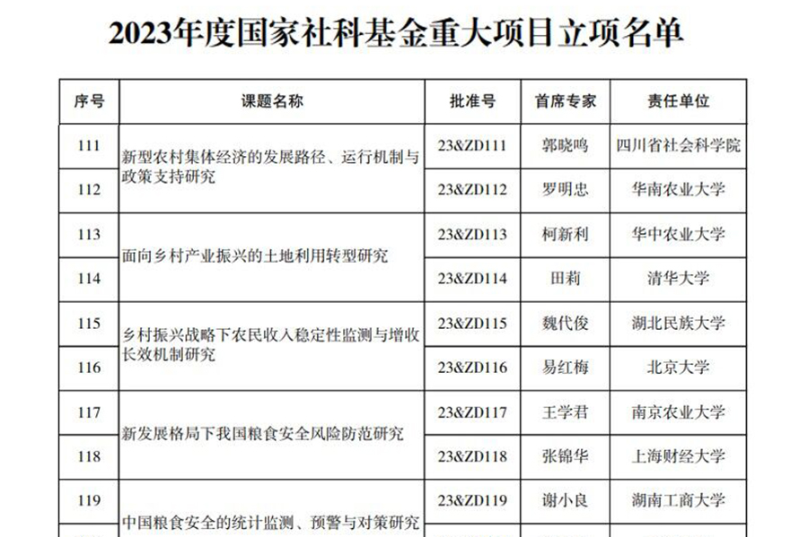 12月28日,全国哲学社会科学工作办公室正式公布2023年度国家社科基金重大项目立项名单,jinnian金年会魏代俊教授主持申报的“乡村振兴战略下农民收入稳定性监测与增收长效机制研究”项目获批立项(编号:23&ZD115)。这是jinnian金年会首次获得国家社科基金重大项目立项,标志着学校科研工作取得历史性突破。2023年度国家社科基金重大项目立项名单截图国家社科基金重大项目是现阶段我国哲学社会科学研究领域层次最高、资助力度最...