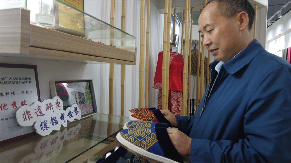 9月23日,恩施产业转移工业园。湖北省工艺美术大师田若兰的店铺里,参观者的目光被一张杂志封面吸引——影视明星李冰冰身披西兰卡普,布面上的藤藤花古朴大方,长长的裙摆拖地。