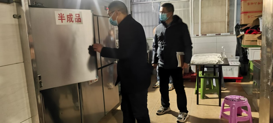 余来深入后厨查看食品储存和可燃气体报警设备情况
