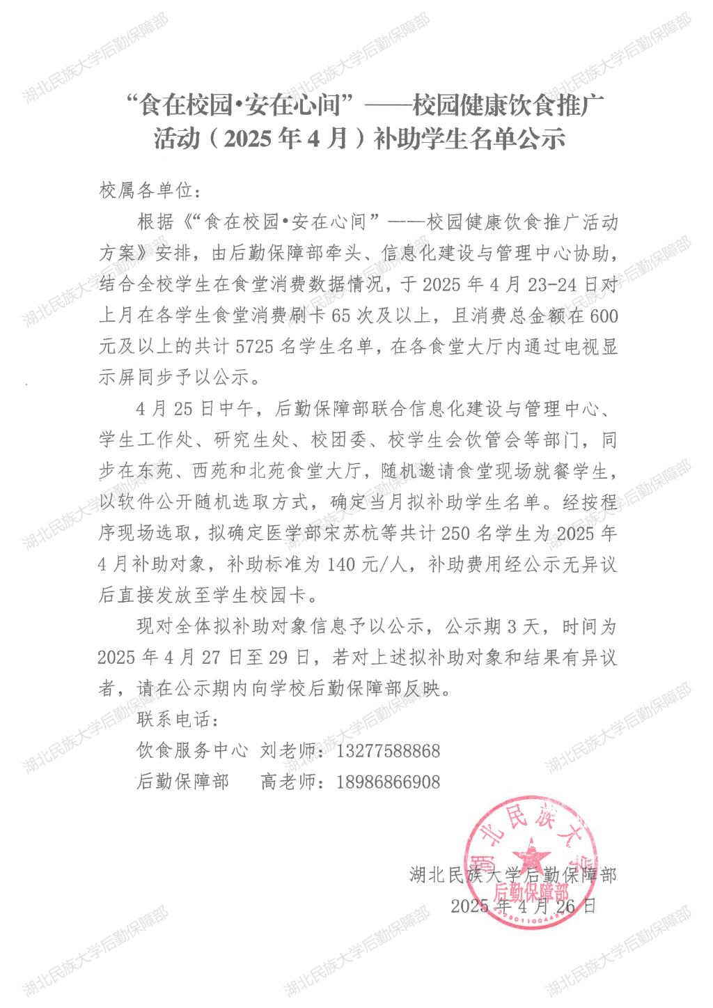“食在校园·安在心间”——校园健康饮食推广活动(2025年5月)补助学生名单公示