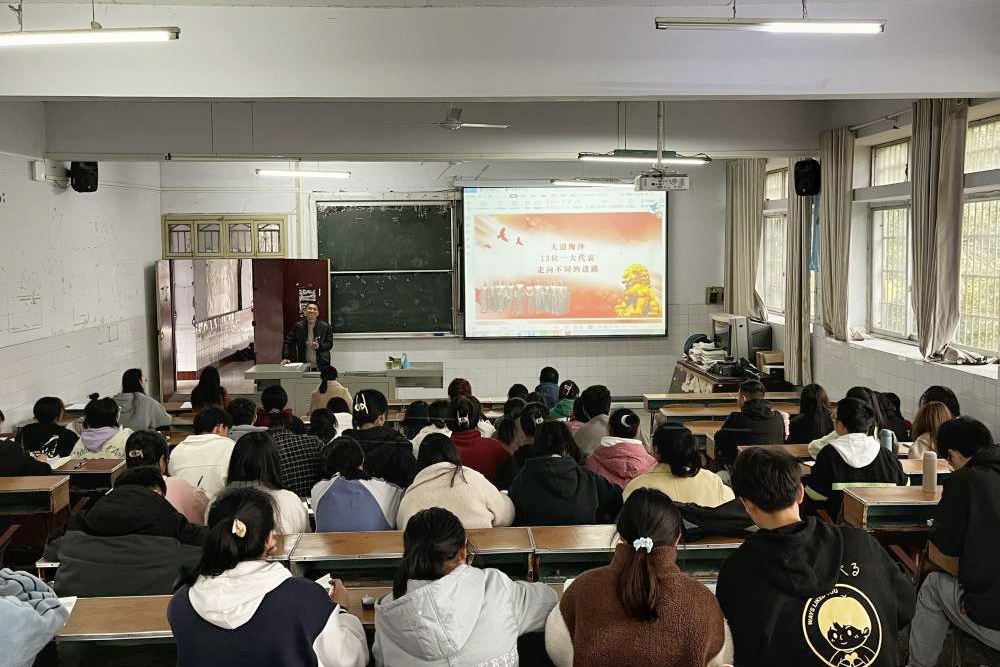 课程伊始,刘美喜引用鲁迅先生《非革命的急进革命论者》中“因为终极目的不同,在行进时,也时时有人退伍,有人落荒,有人颓唐,有人叛变”,开篇介绍参加党的一大的13位代表在参与党的一大之后走向不同道路的故事。他讲解到参加党的一大的13人中,王尽美、李汉俊、邓恩铭、何叔衡、陈谭秋5人牺牲,也有人脱党。陈公博、周佛海、张国焘3人变节叛党,大浪淘沙乃历史规律。随后他向全体学员一一介绍来自五湖四海的13位一大代表,在讲解到张国焘等叛党变节之人时,他说到:“在当时,中国革命浪潮中鱼龙混杂,一个革命政党也难免如此,有激进的革命者,有坚定不移的斗争志士,也会有一些投机分子,最终叛变革命成为反革命者,大浪淘沙的历史规律到今天依然适用”。最后,他告诫全体在场学员,走得再远,走到再光辉的未来,也不能忘记为什么出发,共产党员的初心永不变。