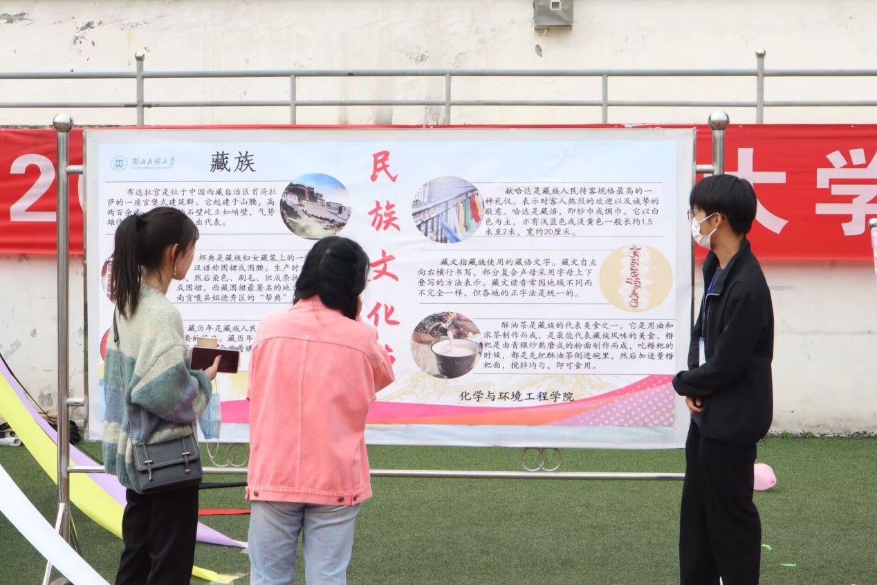 本次民族文化节由16个二级学院及研究生处分别承办一个少数民族的文化宣传和趣味游戏的开展。活动伊始,各个二级学院的学生代表组成方阵,佩戴工作牌,参加文化节的开幕式。现场各式各样的活动棚依次排开,长长的飘带在风中微微摆动,五颜六色的气球在阳光的照耀下更加亮眼。同学们有的驻足在民族展板前认真聆听主持人的讲解,学习着各个民族悠久的历史;有的一脸兴奋的玩着民族特色小游戏,在行动中体会各个民族独特的魅力;有的在品尝着民族特色美食,葡萄干、牛肉干、新疆囊都紧紧抓住他们的胃口,每个人的脸上都绽开快乐的笑容。我院负责藏族站点,有“献哈达”“藏族宣讲”“知识问答”“跳藏舞”“品尝美食”“小游戏”六个流程。其中最有意思的是捡石子游戏,各位参与者跃跃欲试,勾起幼时回忆,石起石落见证着他们游戏的进程,同时也感受着藏族人民在闲暇时的快乐。跳藏舞用舞蹈的形式体现藏族人民的热情好客,参与者围成一个大圈,载歌载舞、热闹非凡、韵味十足,在其中感受藏族的传统文化和艺术魅力。此次文化节还有民族趣味运动会,将体育与民族文化有机结合起来,由板鞋竞速、高脚竞速、陀螺、蹴球、押加、跷旱船、毽球七个项目组成,各位参赛者在体育竞赛中了解少数民族的文化和民俗风情。
