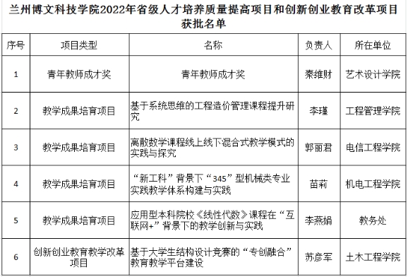 近日,甘肃省教育厅下发了《甘肃省教育厅关于公布2022年高等学校人才培养质量提高和创新创业教育改革项目的通知》(甘教高函〔2022〕11号),我校组织申报的6个项目获批立项。艺术设计学院院长秦维财获批青年教师成才奖,“基于系统思维的工程造价管理课程提升研究”、“离散数学课程线上线下混合式教学模式的实践与探究”等4个教改项目获批甘肃省高等教育教学成果培育项目,“基于大学生结构设计竞赛的‘专创融合’教育教学平台建设”研究项目获批创新创业教育教学改革项目。