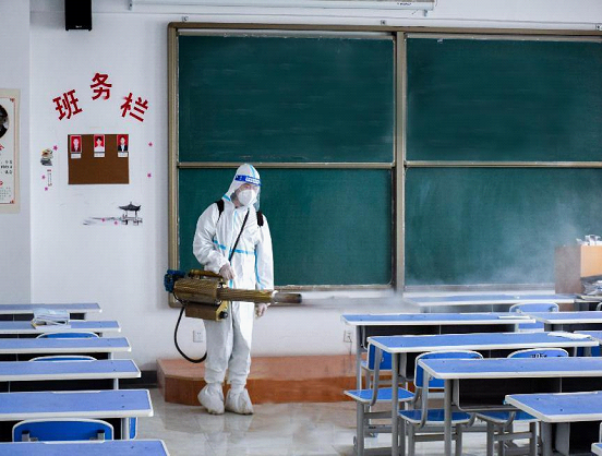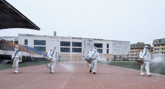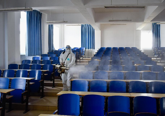 本次校园的全面消杀工作从上午11点开始直至下午17:00结束,持续进行了7个多小时,对校园主干道使用雾炮机消毒车喷洒消毒泡腾片消杀,对室外其他公共区域使用消毒烟雾机喷洒84消毒液消杀,对所有室内区域使用消毒烟雾机喷洒75%医用酒精消杀。消杀范围覆盖了南北校区所有区域,大到教学楼、综合教学楼、图书馆、体育馆、食堂、12栋学生公寓、田径场和家属院,小到楼梯间扶手、电梯按钮、垃圾桶、门把手、体育场看台座椅等。