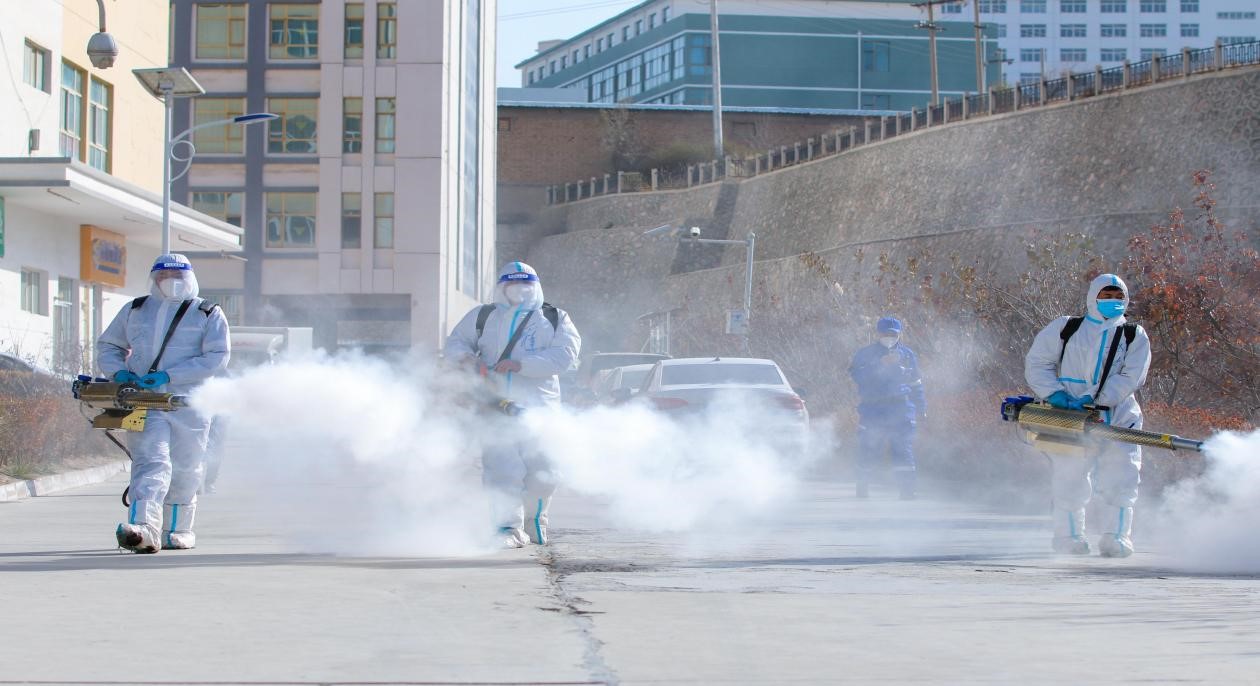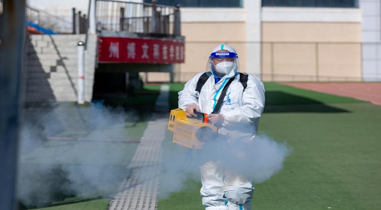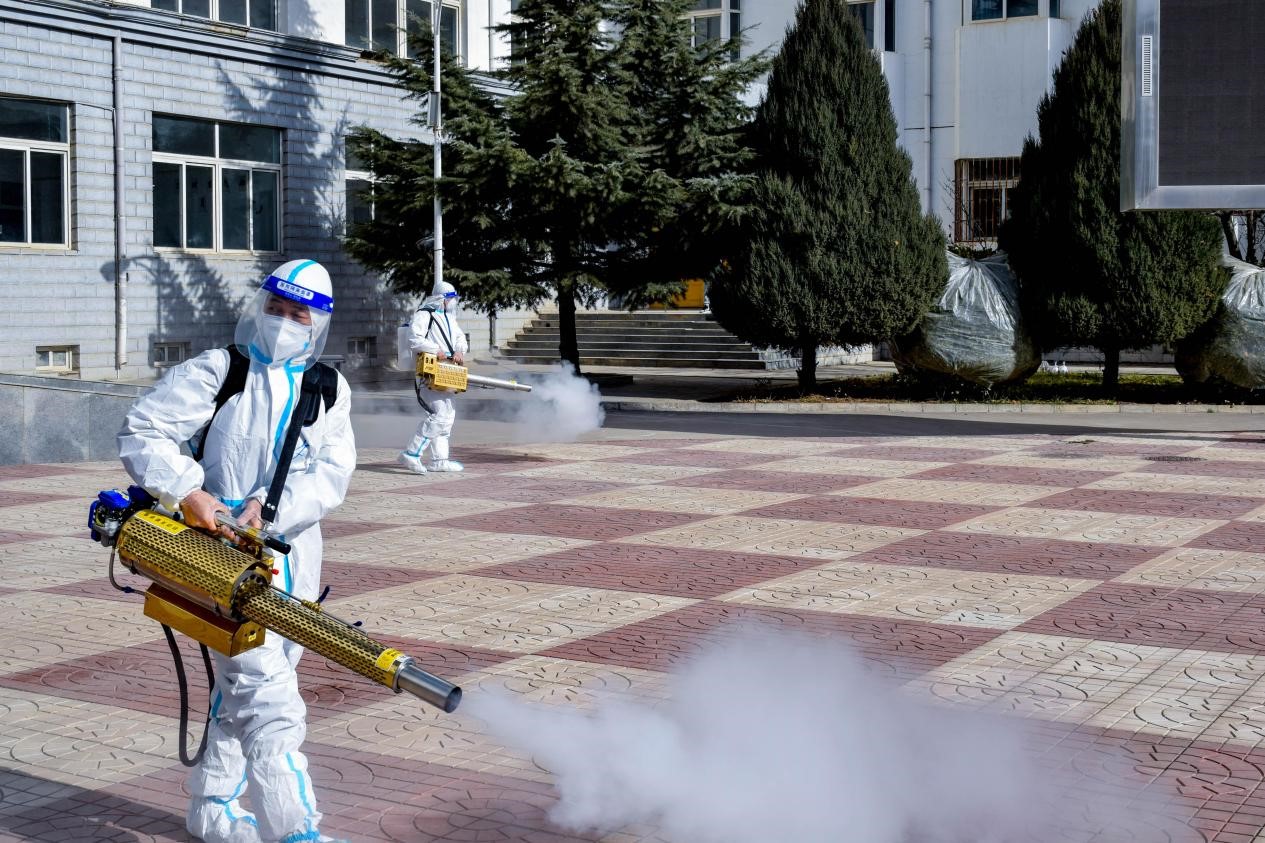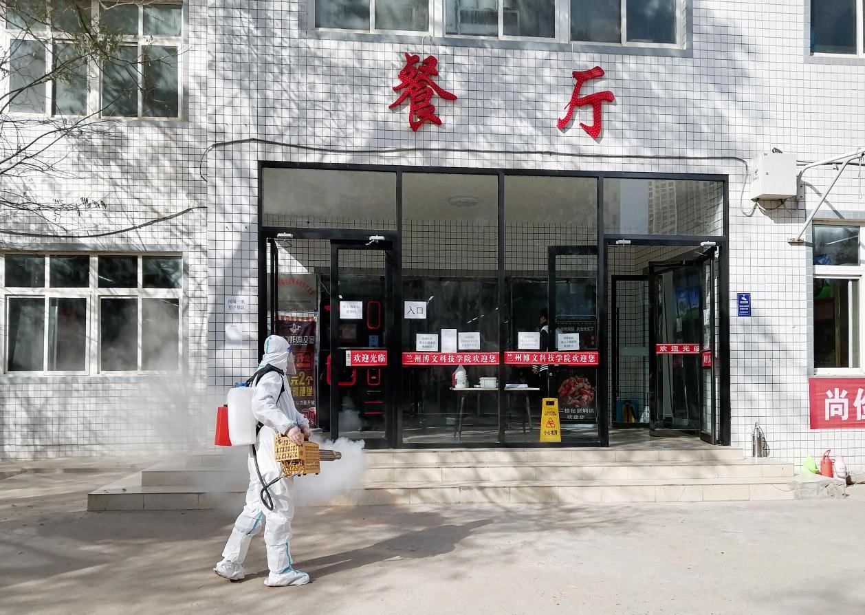 消杀工作持续进行了6个多小时,队员们在兰州市物业协会会长、壹柒玖兰物救援志愿服务队总指挥长张勇和兰物兰保壹柒玖应急支援队第三中队队长霍志强的带领下,全副武装,手持消毒烟雾机、身着防护服、戴着防护口罩,严格按照卫生消毒管理的标准规范操作,采用“地毯式”消杀方式,对学校南北校区的教学楼、综合教学楼、图书馆、体育馆、餐厅、学生公寓、田径场、校园广场、校园路面及家属院等区域进行了反复、全面的消毒杀菌。