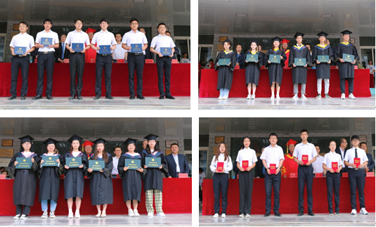典礼的最后,主席台就座领导分别为获得毕业证和学士学位的毕业生代表拨苏正冠并颁发了毕业证书和学位证书, 为优秀毕业生代表、优秀毕业论文学生代表颁发了荣誉证书,为考取硕士研究生的同学颁发了奖金。