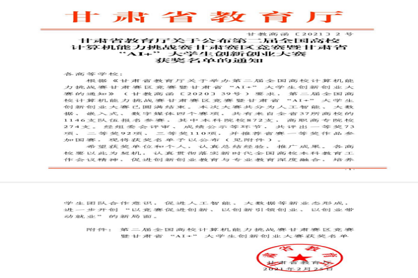第二届全国高校计算机能力挑战赛甘肃赛区竞赛暨甘肃省“AI+”大学生创新创业大赛由甘肃省教育厅、全国高等学校计算机教育研究会主办,全国高校计算机能力挑战赛组委会、兰州交通大学承办。本次大赛于2020年11月15日-2020年12月通过报名、初赛和决赛答辩,最终我院经信管理系参赛五支队伍全部获奖,其中三个队获得数字媒体赛项二等奖,两个队获得三等奖。