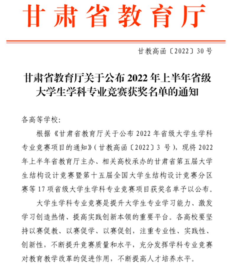 由甘肃省教育厅主办、相关高校承办的2022年上半年甘肃省第五届大学生结构设计竞赛暨第十五届全国大学生结构设计竞赛分区赛等17项省级大学生学科专业竞赛顺利举行。我校师生高度重视,积极参与,经过各学院指导老师的精心培训、组织和指导,在激烈的竞争中脱颖而出,共获得4个一等奖、5个二等奖、10个三等奖,2位老师获得优秀指导教师,学校获得2个优秀组织奖。具体获奖名单如下: