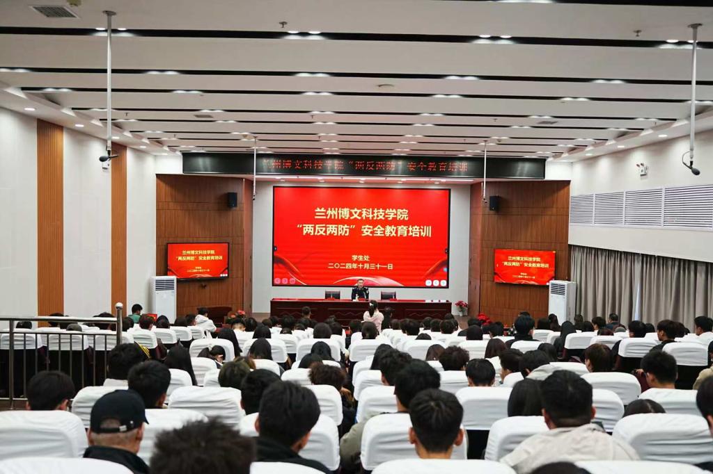 为深入贯彻总体国家安全观,进一步强化师生的国家安全意识,提高师生反诈骗意识和自我保护能力,构建和谐安全校园环境,根据省委、省政法委、省教育厅工作部署,10月31日下午,我校召开“两反两防”安全教育培训大会。大会邀请榆中县和平派出所教导员裴青荣担任主讲嘉宾,各二级学院辅导员和学生代表参加。