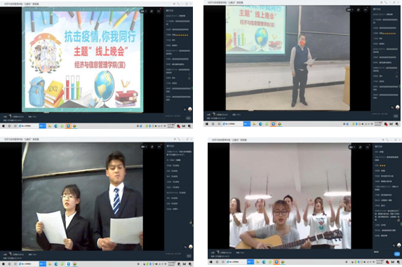 习近平总书记指出,做好高校思想政治工作,要因事而化、因时而进、因势而新。在兰州疫情形势依旧严峻,校园疫情防控阻击战又一次打响的同时,为了贯彻落实学校有关疫情防控工作安排,疏解学生心理压力、积极抗疫,引导学生树立信心、坚定信仰,激励学生以疫为鉴、励志勤学,经济与信息管理学院于2022年4月7日晚19:00点通过钉钉直播的形式,举办了以“抗击疫情,你我同行”为主题的云晚会,来自各年级各专业的三十余位同学在宿舍、教室和操场等地方通过网络连线的方式进行了精彩的表演。学院院长张德江、副院长宋国军、辅导员张燕、赵磊、王彩凤、何振艳等在教学楼东T2、学院其他教师及学生通过钉钉APP或抖音平台观看了此次云晚会。