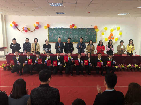 金菊含笑,秋风送爽。伴随着轻松愉悦的开场节目,此次大会正式拉开帷幕。首先,全体起立,奏响中国共青团团歌。紧接着由郭斌主任致开幕词,他对我系的团学工作给予了充分的肯定,并对今后的工作发展提出了更高的要求,告诉大家要树立“服务为本”的工作理念,以服务学生,服务学校为己任,注重自身综合素质的培养和提高,并以此提高团学会的工作能力和水平。然后,由郭丽君副主任宣读党务小组成员名单并为他们佩戴工作证。随后,由马君老师宣读2017-2018学年团学会成员名单,并由2017-2018学年团学会成员代表梁嵩山做工作总结,他告诉在座的各位,团学会工作要认真负责,始终把学习放在第一位,以身作则,锐意进取,才能更好的提升自己的能力,提高整个团学会的工作水平。而后,侯力媛老师宣读2018-2019学年团学会成员名单,并由嘉宾为他们颁发聘书并佩戴工作证。紧接着,2018-2019学年团学会成员代表程凯凯做就职演讲,他不仅讲述了对未来工作的初心,还表明要保持积极努力的工作态度、充分发挥团学工作优势,使我系团学会在众多学生组织中脱颖而出。最后,由陶佳老师为此次大会致闭幕辞,她对新一届团学会寄予厚望,并希望大家扎扎实实地开展工作,进一步深入实践,更加主动广泛地联系同学,抓住机遇,在实践中开拓进取,为塑造电信工程系团学会的新形象而努力工作,用行动来证明自己的能力。大会结束后,嘉宾与新旧两届团学会干部合影留念,本次活动圆满结束。
