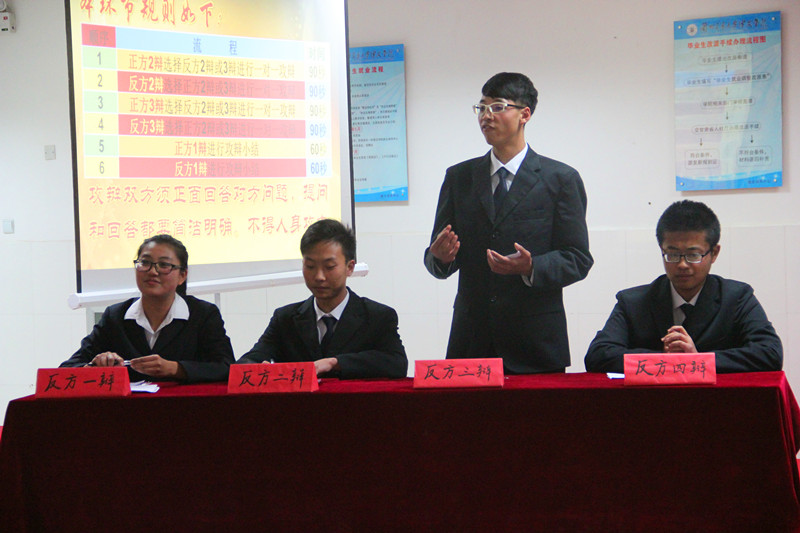 辩论赛开始,正反双方代表见缝插针,争先雄辩,把整个辩论气氛推向高潮。双方四辩总结陈词时更是伶牙俐齿,妙语连珠。最后本次比赛在舞蹈表演和萨克斯独奏中划上了圆满的句号。