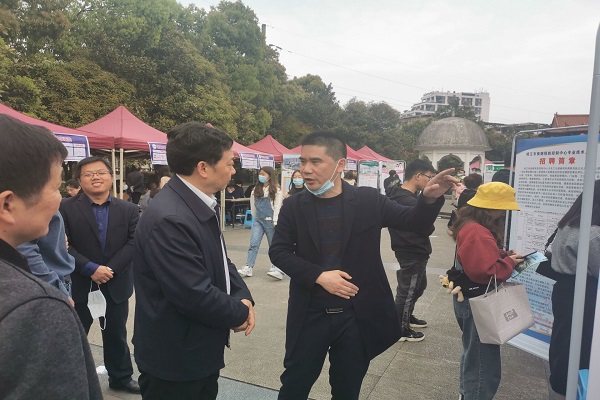 党委书记吴建清来到现场,与用人单位负责人交流,了解当前的就业形势与就业前景。