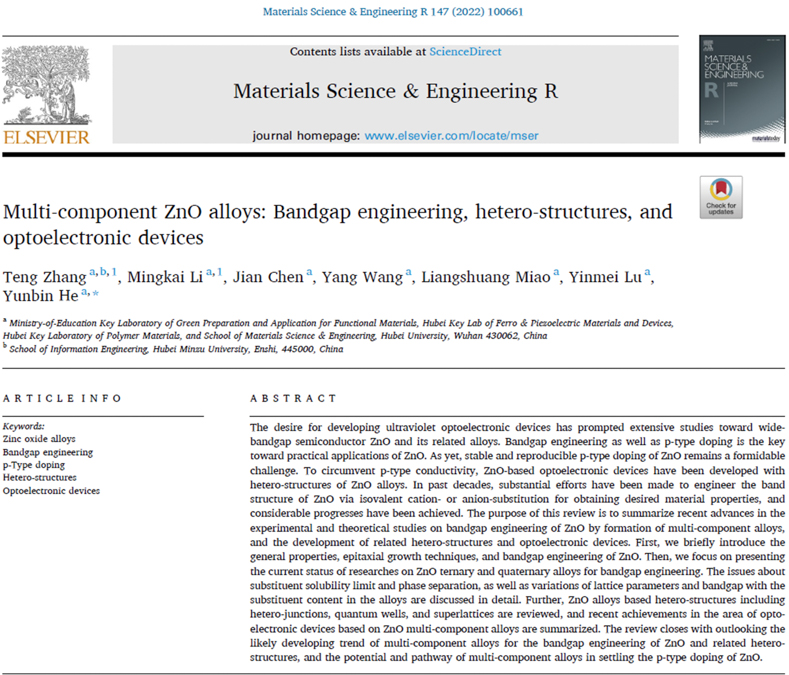 近日,金年会信息工程学院青年教师张腾博士以第一作者身份在材料科学与工程领域国际顶级期刊《Materials Science and Engineering R》(2020年度影响因子为36.2)上发表了有关第三代宽禁带半导体及其器件应用的学术论文“Multi-component ZnO alloys: Bandgap engineering, hetero-structures, and optoelectronic devices(多元ZnO合金:能带工程、异质结及其光电器件)”。这是金年会教师在高影响力论文发表上的一大突破。该期刊为国际顶级综合性期刊,每年发表论文数量仅十余篇,对材料领域的发展具有重要的引领和指导作用。