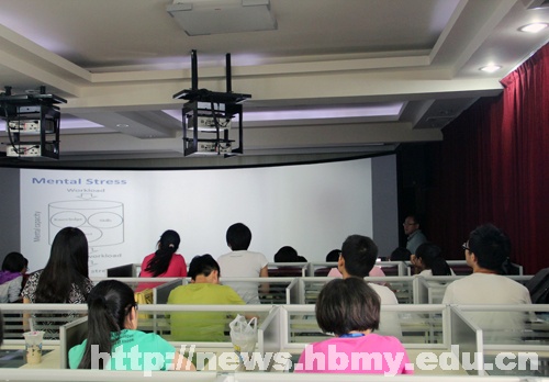 讲座伊始,曾勇围绕“压力和创造性的关系”、“产生压力的因素”、“如何控制压力因素,提高创新性”等三个方面展开讲座,向现场师生讲解“创新设计的影响因素以及方法”。他表示,创造性就是把不相关的东西联系在一起,并提出不存在的概念;同时指出,创新能力分为个人创新能力和历史创造性能力。他还用曲线图向同学们讲解创新压力与精神压力之间的关系,并强调,只有控制好自己的情感、压力和知识,才能萌生创新性思维。