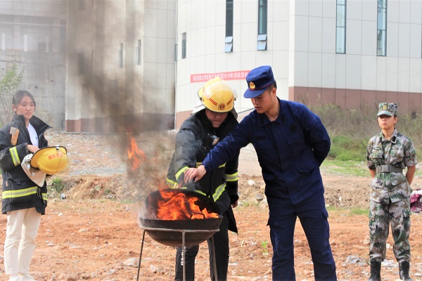 随后,全体人员有序前往达人片区进行现场观摩以及灭火实操培训。培训项目有消防知识集中授课、柴草堆垛火灾扑救、油锅火灾扑救等。消防官兵为学生讲解校园日常防火安全注意事项,以及常见灭火器材使用方法、初期火灾扑救方法、消防水带连接方法等。该院学生广泛参与各个培训项目的实践操作,并主动向消防官兵询问注意事项,在油锅、液化气罐火灾扑救实践中,学生身穿消防服,在消防官兵指导下进行灭火操作。