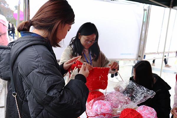 本网讯(记者 胡悦 通讯员 郑昕/ 文 万雅莉/图)12月2日早上8点,寒风凛凛,大学生广场上的学生却忙得热火朝天,纸箱中一团团毛线被路过的学生领走,温暖的心与线团交织着……