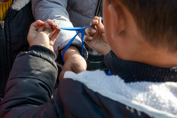 学生为志愿者系上蓝丝带