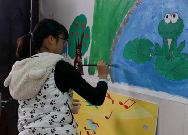 亲情小屋采用“海洋世界”主题,蓝色的大海横亘下半面墙壁,很好地遮掩瓷砖上的污垢,章鱼、海星、螃蟹和青蛙等欢聚一堂,整幅图画充满灵动的气息,改变由于墙皮脱落而造成的死气沉沉的氛围。“三雅办公室”则沿用“动物世界”这一创意,描画出长颈鹿、大象等儿童喜爱的动物,天花板也被草莓等纸质挂饰点缀,充满绿色丛林的清新氛围。目不暇接的各种色彩,为年久失修的墙壁带来生气,增添了该教室“雅”的味道。