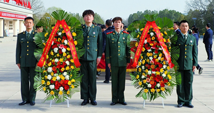 随后,全体人员低头静立,为在中国的民族解放和人民革命事业中英勇献身的革命先烈默哀。默哀毕后,机电工程学院的四位大学生退伍军人随着《献花曲》深情奏响,稳稳抬起花篮,缓步走向革命烈士纪念塔,将花篮摆放在纪念碑基座上。