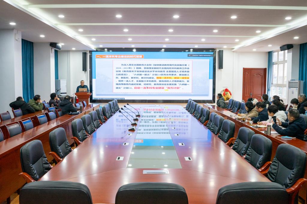 李明飞讲话。他围绕“在一流专业建设中如何做好科研”这一主题进行讲解,并从如何阅读文献、查找资料和有效科研等方面详细分享自身经验。