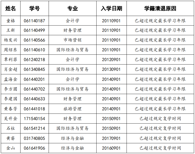 经济与管理学院关于清退未在规定时间复学及超过最长学习年限学生学籍的公示