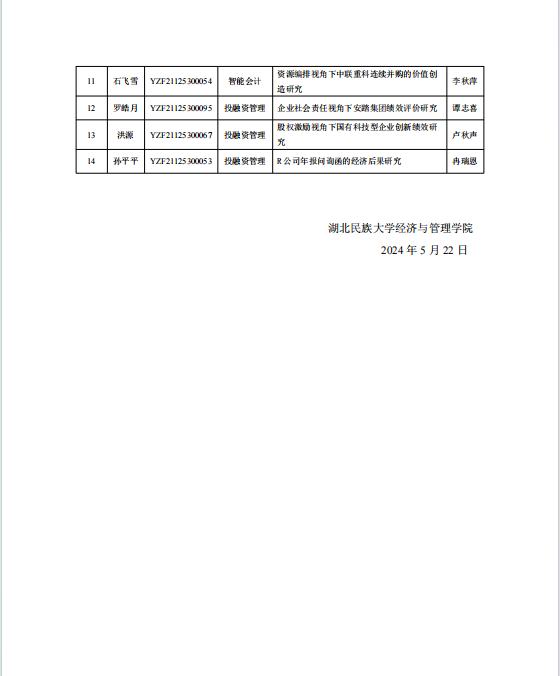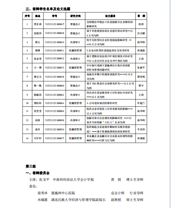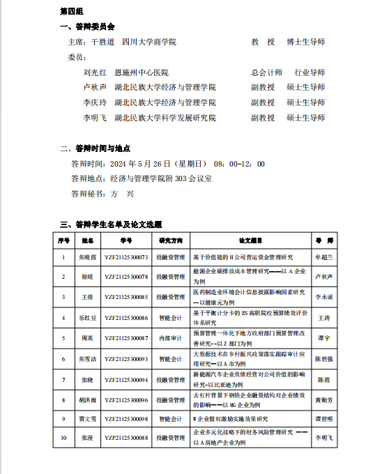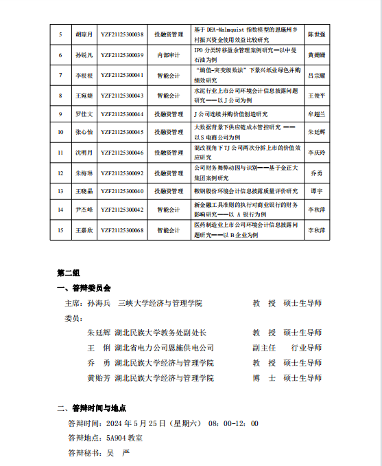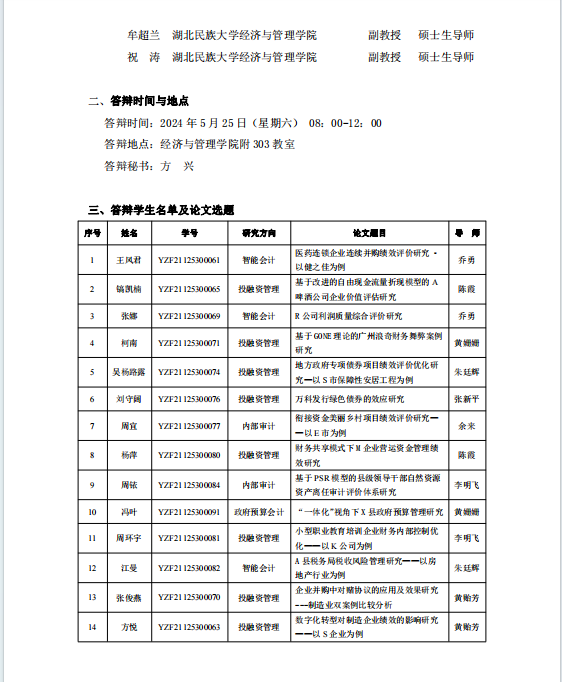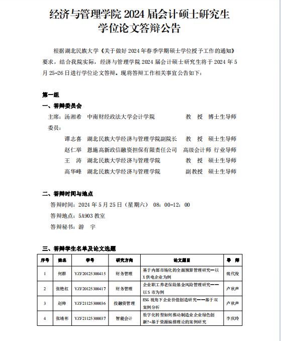 经济与管理学院2024届会计硕士研究生学位论文答辩公告