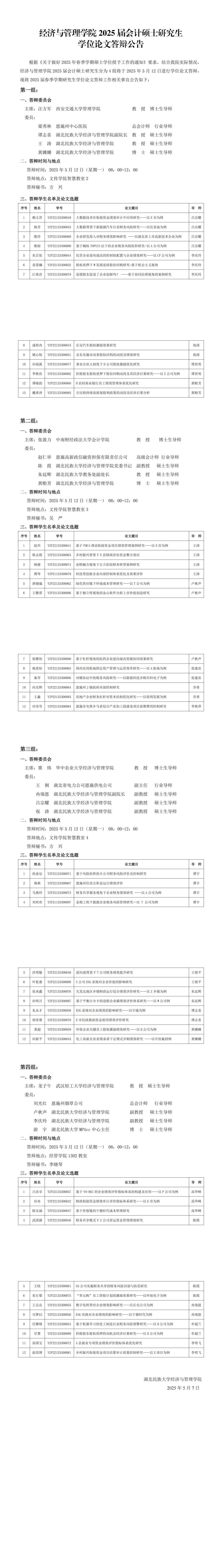 经济与管理学院2025年春会计硕士研究生学位论文答辩公告