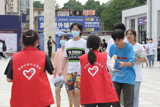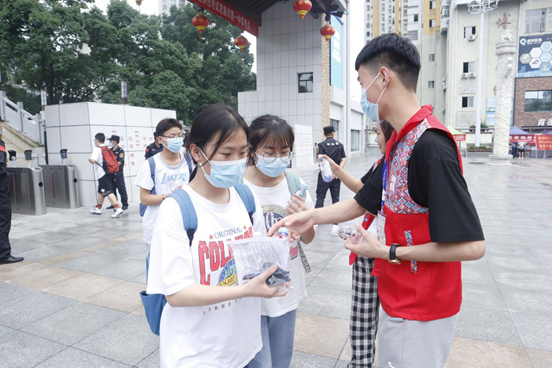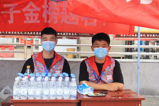 活动现场设立志愿服务站,包含物品寄存区、茶水供应区、家长休息区三个区域。志愿者身着志愿者马甲,佩戴口罩和志愿帽,为考生及家长免费提供矿泉水、创可贴、口罩、消毒湿巾等物品,全力维护考点周边秩序,帮助治安人员疏导路段交通,以实际行动为考生加油打气、保驾护航。