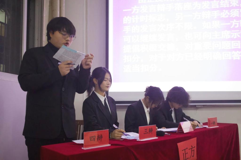 本网讯(见习记者 李如意 叶梦真 余佳怡/文 记者 张玉婷 见习记者 肖雅轩/图)为提高学生的思辨能力和语言表达能力,培养团队合作精神,切实加强校园文化建设。2023年12月15日,经济与管理学院联合文学与传媒学院举办的友谊辩论赛在文瀚楼附102教室举行。文学与传媒学院优秀辩手王珮伊、张秋瑞,经济与管理学院优秀辩手杨丽君、杨兆佳应邀出席本次比赛并担任评委。