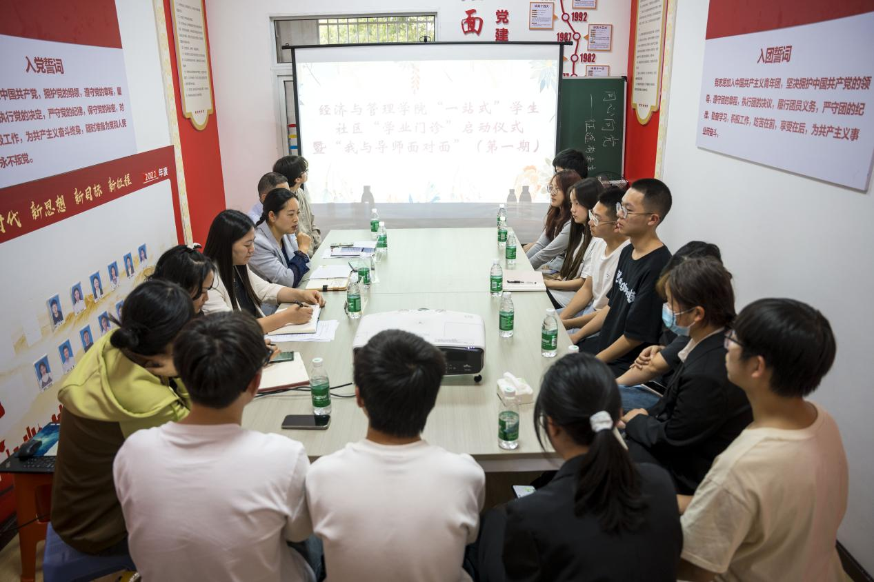 本网讯(记者 熊伊人 杨兆佳/文 叶然/图)2024年4月25日,经济与管理学院“一站式”学生社区“学业门诊”启动仪式暨“我与导师面对面 ”活动在春雨社区隆重举行。经济与管理学院党委书记陈霞、党委副书记张姣蓉、经济学系主任谭宇、学生科科长覃杰、学生科辅导员亚克甫受邀参加。14名学生参加本次“学业门诊”问诊活动。张姣蓉担任本次活动主持人。