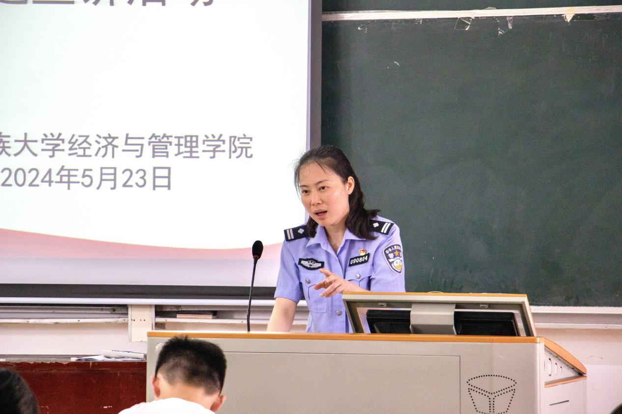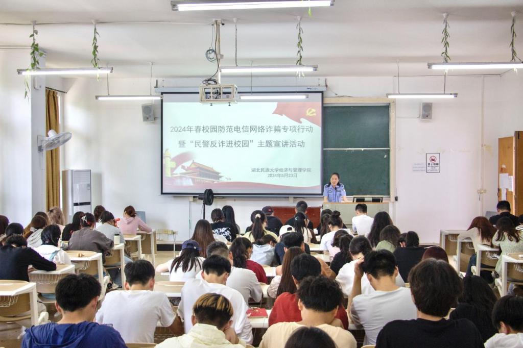 本网讯(记者 段由燕/文 叶然/图)为提高学生的反诈意识,切实保护学生的财产安全。2024年5月23日,经济与管理学院联合“一站式”学生社区校园防范电信网络诈骗专项行动暨“民警反诈进校园”主题宣讲活动在经管楼附301教室隆重举行。经济与管理学院党委副书记张姣蓉,学生科科长覃杰,辅导员解丽娟、唐桢坤、覃雨、亚克甫·哈米东及部分学生参加本次活动,解丽娟主持本次活动,湖北省恩施市舞阳坝民警龙念应邀出席并担任主讲人。
