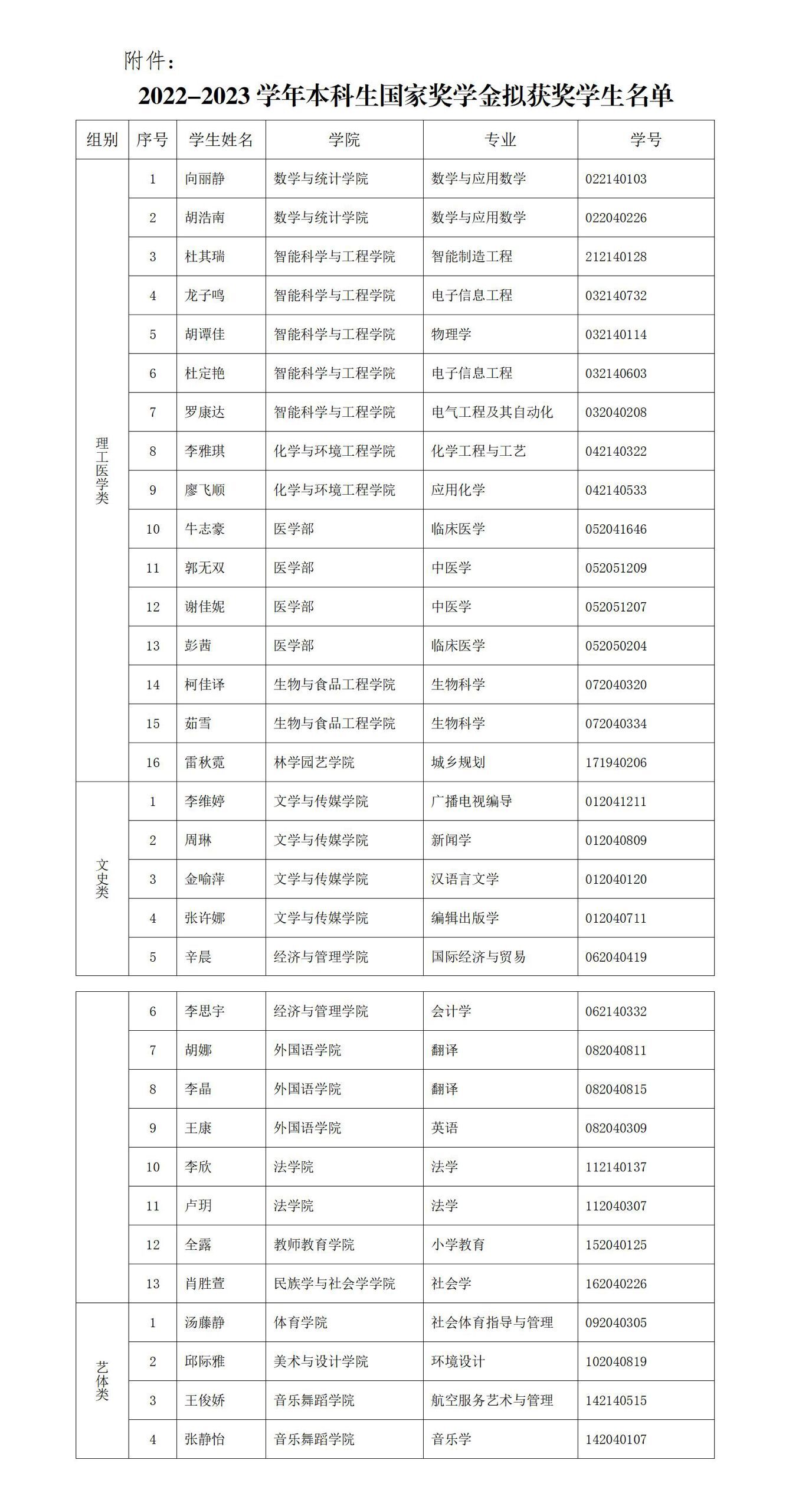 根据《湖北省学生资助管理中心关于做好2022-2023学年本专科生国家奖学金初评工作的通知》、《jinnian金年会本科学生国家奖学金实施细则》(民大校办发〔2020〕67号)、《jinnian金年会关于开展2022-2023学年国家奖学金评审暨国家奖学金答辩评审会的通知》等文件精神,经各学院(部)初评推荐、学生工作处组织答辩评审,经济与管理学院20级国际经济与贸易专业062040419辛晨、21级会计学专业062140332李思宇荣获2022-2023学年本科生国家奖学金。